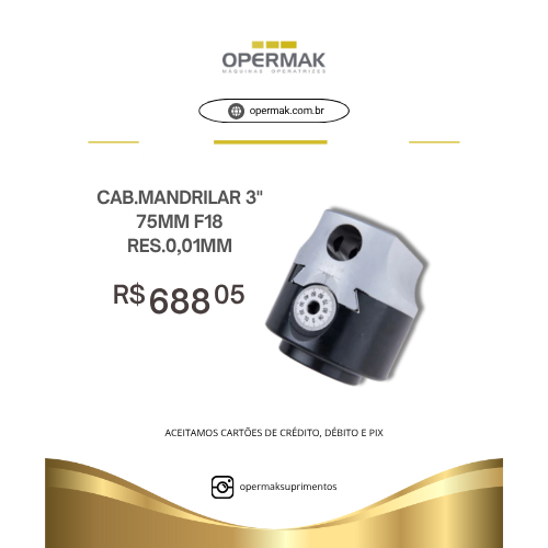 Conheça o Cabeçote Mandrilador 3" Opermak, ideal para trabalhos de usinagem com alta precisão. Com 75mm de diâmetro e resolução fina de 0,01mm, este equipamento oferece ajuste de mandril estável e resistente. Fabricado com componentes robustos, garante durabilidade mesmo em operações prolongadas. Sua construção otimizada permite máxima segurança e eficiência no ajuste do mandril para fresadoras e outras máquinas operatrizes. Compatível com diversas aplicações industriais, é uma escolha técnica para profissionais exigentes.